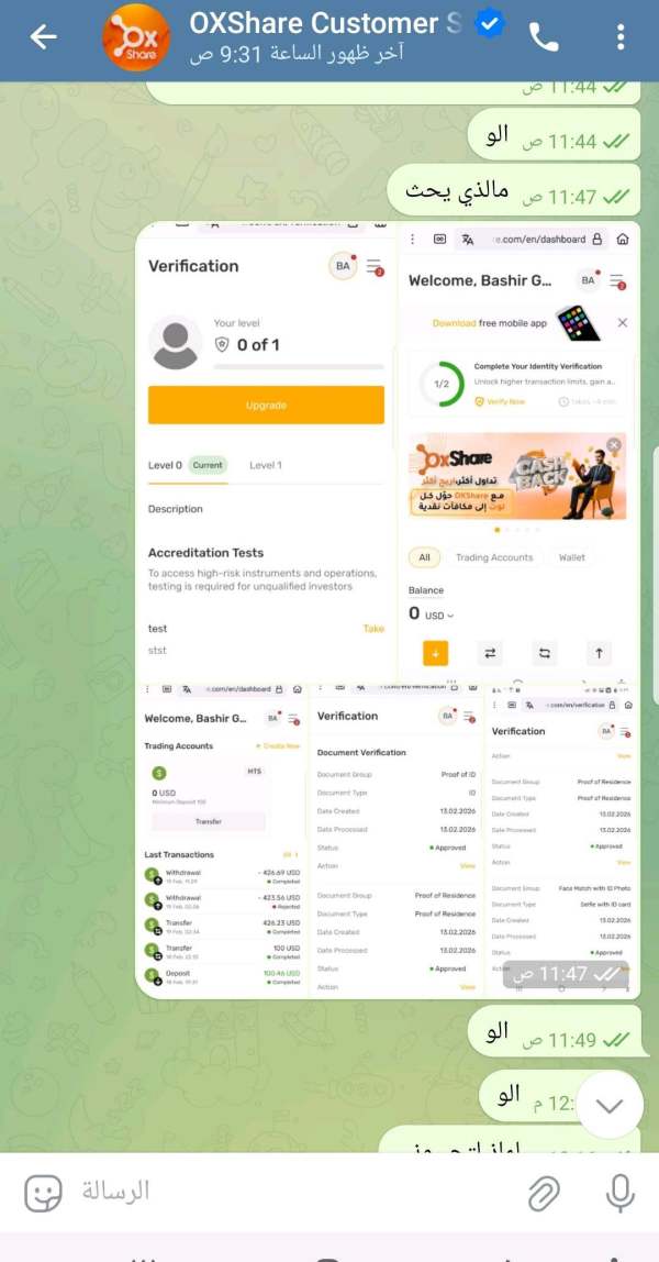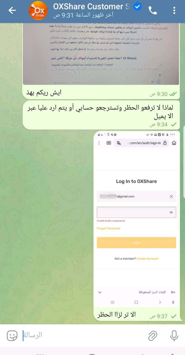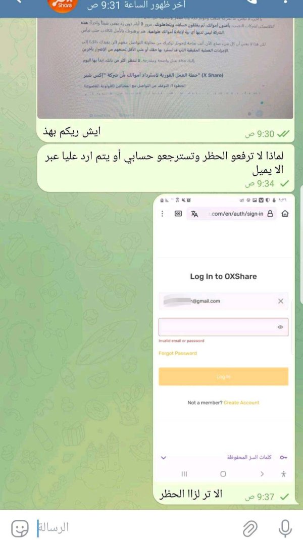 ⚠️ شكوى وتحذير بخصوص OXShare ⚠️ أقدم هذه الشكوى لتحذير المتداولين من تجربتي مع شركة OXShare. قمت بإيداع مبلغ 426 دولار عبر USDT (شبكة TRC20). بعد فترة قصيرة تم حظر حسابي ومنعي من الوصول إلى أموالي. حاولت التواصل عبر: الدعم الفني البريد الإلكتروني تيليغرام ولم يتم حل المشكلة حتى الآن. بعد مراجعة معلومات الشركة تبين: التسجيل في Saint Lucia (IBC) فقط، وهو تسجيل تجاري وليس ترخيص وساطة مالية. لا يوجد ترخيص واضح من جهة رقابية قوية مثل FCA أو ASIC. توجد شكاوى متكررة من متداولين بخصوص صعوبة أو رفض عمليات السحب. ⚠️ أنصح أي متداول بعدم تحويل أموال عبر العملات الرقمية لمنصة غير خاضعة لتنظيم مالي قوي.