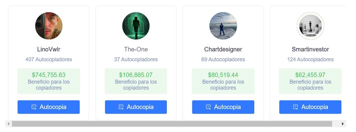 Tienen muy buenos creadores de señales. Hace solo una semana este proveedor de señales tenía solo 170 000 $ ganados. Ahora he mirado y GUAU. Está en 745 000. Un 93 % de operaciones ganadoras. ¡Increíble! Nunca me gustó la copia de operaciones. He ido aprendiendo por mi cuenta, pero ahora entiendo por qué todos los brókeres empezaron a ofrecer opciones de copia de operaciones. Lamentablemente, no todos podemos ser ganadores y tener tiempo. Después de 4 años de intentarlo y ver estos resultados, también empecé a copiar a otros operadores más exitosos. Las comisiones de las copias en Naga son muy bajas, del 5 %, y solo me cobran si la operación termina siendo fructífera.