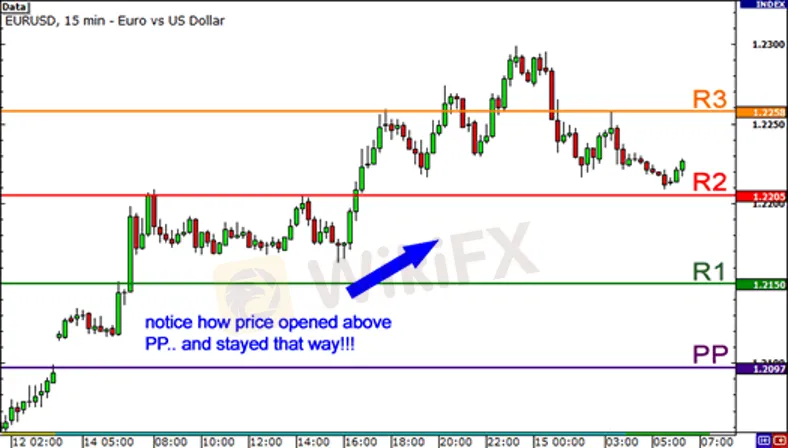Ở ví dụ này, chúng ta thấy rằng cặp tiền EUR / USD tăng và mở phía trên điểm xoay.