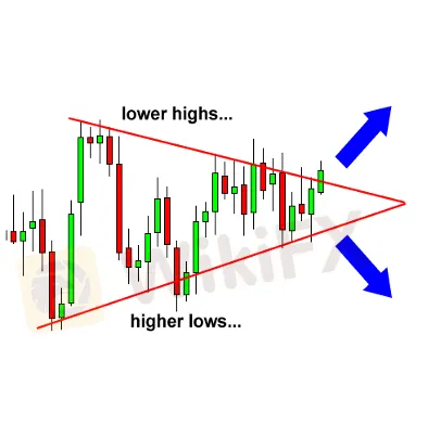 Trong biểu đồ bên trên, có thể thấy cả phe mua lẫn bán đều không thể đẩy giá đi theo chiều của họ muốn. Điều này thể hiện trên biểu đồ qua việc giá tạo các đỉnh thấp hơn và đáy cao hơn.