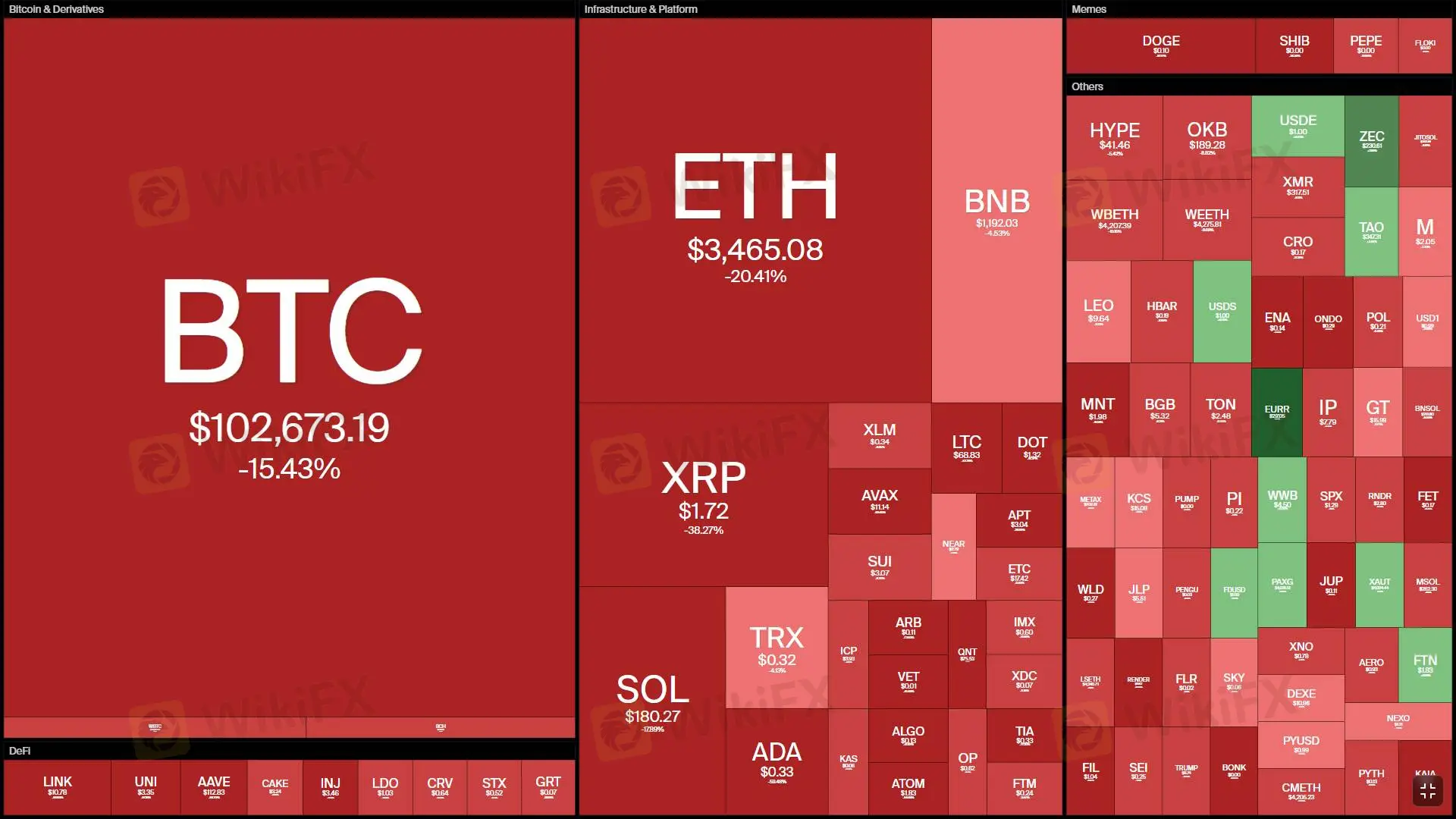 Vốn hóa thị trường tiền số bốc hơi hơn 380 tỷ USD, từ 4,25 nghìn tỷ xuống 3,82 nghìn tỷ USD, với Bitcoin lao dốc từ trên 115.000 USD xuống dưới 102.000 USD, tạo cây nến biến động 20.000 USD – lần đầu tiên trong lịch sử.