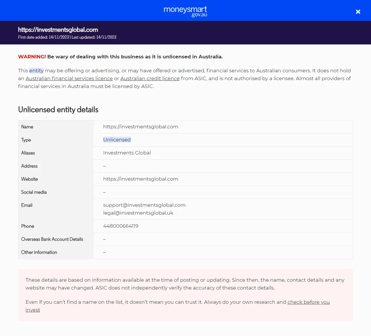 LoạiCung cấp dịch vụ tài chính (bao gồm các sản phẩm tài chính) cho người dân tại Úc mà không có giấy phép. Họ không có giấy phép dịch vụ tài chính Úc (AFS) hoặc giấy phép tín dụng Úc từ ASIC.
