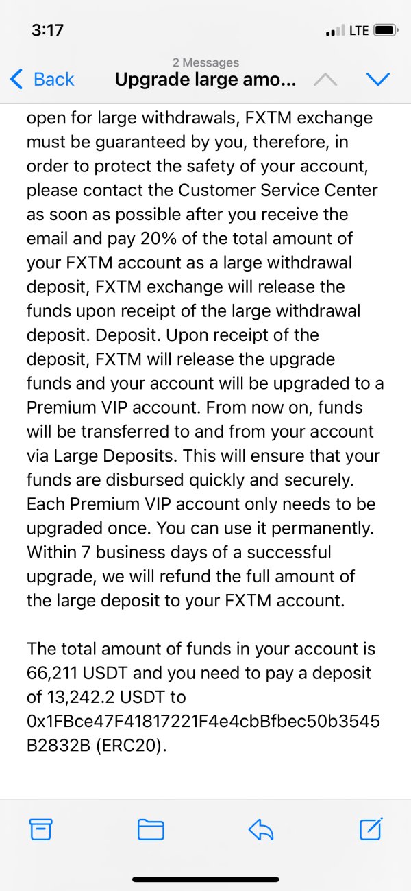Based on a group recommendation I started trading in FXTM from my Trust Wallet at fxtms.org which had the logo of FXTM (see pict below). I did some diligence and saw FXTM was legit and regulated. So I did some trading with small money and had some success, and was able to withdraw my funds. I than added $22,000. After some trading (ups and downs), I was able to get my account to $67.000. I than tried to withdraw about $30,000 and I received an email asking me to upgrade to a premium account before they release my withdraw. Of course this upgrade requires me to pay a $13,000 fee which I did not do. Never was this explain to me till I attempted to get my money back. Basically a bait and switch and they are holding my money hostage for the fee. If someone can advise me on getting it back that will be appreciated. I think this was a SCAM - from the group to platform used. I will add a copy of the people and there pictures on the group as well.