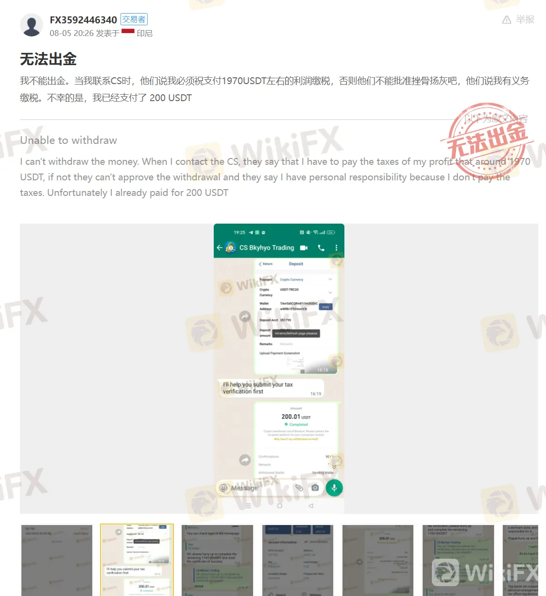 上周五(8月5日),一位来自印尼的汇友向外汇天眼爆料,使用BKYHYO交易平台交易盈利后,发现该平台无法出金。当其联系BKYHYO平台客服后,客服告知这位汇友,根据国际税收政策的规定,用户需要缴纳账户盈利资金5%的利润税。此后,由于该汇友手头资金不足,经过与平台客服的沟通交流,便向BKYHYO缴纳了200美元税金。
