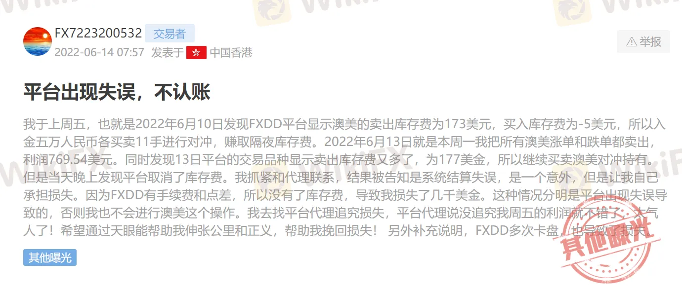前段时间,一位来自香港的汇友向外汇天眼求助称,她在2022年6月10日了解到FXDD平台显示澳美的卖出库存费为173美元,买入库存费为-5美元,故而入金五万人民币各买卖11手进行对冲,以赚取隔夜库存费。随后,此汇友在2022年6月13日把所有澳美涨单和跌单都卖出,那时利润为769.54美元。与此同时,该汇友发现13日平台的交易品种显示卖出库存费又多了,为177美元,因此其继续买卖澳美对冲持有。但令人感到意外的是,在那个交易日的晚上,她看到平台突然取消了库存费。于是,这位汇友立即联系代理,结果被告知是系统结算“失误”,是一个意外,但是损失却让她自己承担。汇友讲述,因FXDD有手续费和点差,没有了库存费,导致他损失了几千美金,这种情况分明是平台出现失误导致的,否则他也不会进行澳美这个操作。