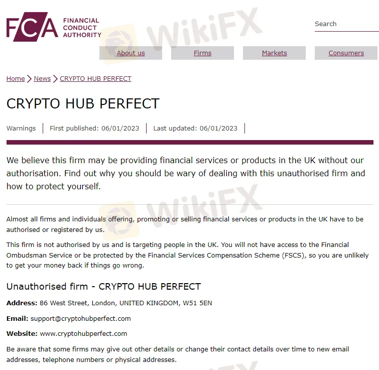 FCA警告称:CRYPTO HUB PERFECT在未经我们授权的情况下在英国提供金融服务或产品,如果一旦遭受资金损失,您将无法使用金融申诉专员服务或受到金融服务补偿计划 (FSCS) 的保护。