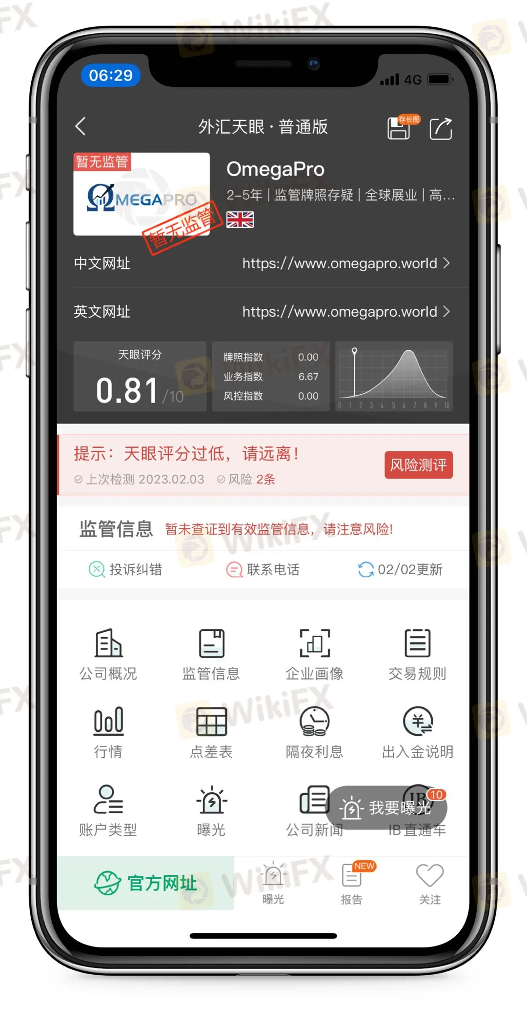 其实有很多方法可以避免出现这样的情况,在做外汇和其他交易之前,可以在我们外汇天眼上面先检索一下该平台是否可靠,就这OmegaPro平台举例,在天眼首页搜索OmegaPro可以得出如下结果