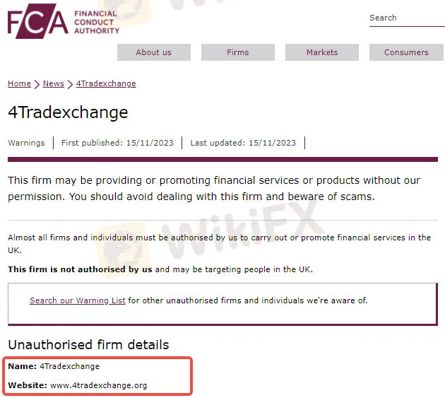11月15日,英国金融行为监管局(FCA)发布了一则投资者警示公告,公告内容称一家名为4Tradexchange的公司可能在未获FCA授权的情况下,向投资者非法提供金融服务或产品。