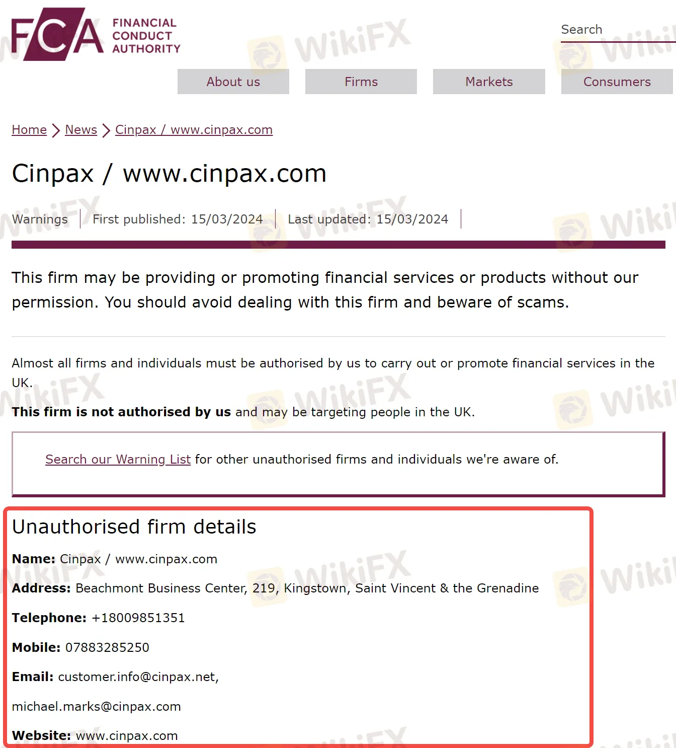FCA认为Cinpax存在欺诈投资者、非法集资等严重违法行为的可能。并警告投资者不要与该公司进行任何交易或投资,如果一旦遭受资金损失,将无法使用金融申诉专员服务或受到金融服务补偿计划 (FSCS) 的保护。