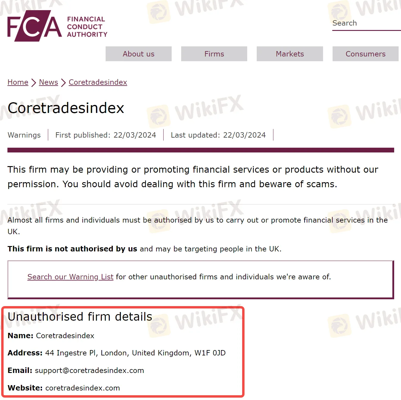 3月22日,英国金融行为监管局(FCA)发布了一则投资者警示公告,公告内容称一家名为Coretradesindex的公司可能在未获FCA授权的情况下,向投资者非法提供金融服务或产品。