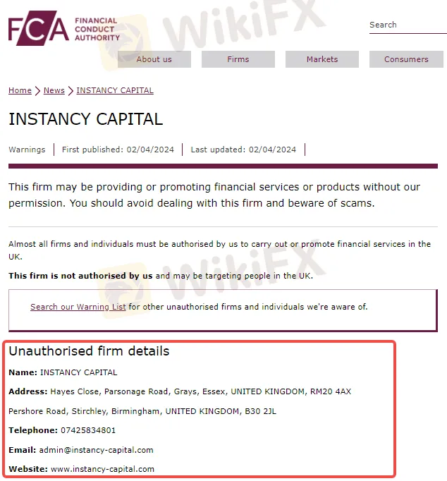 FCA认为INSTANCY CAPITAL存在欺诈投资者、非法集资等严重违法行为的可能。并警告投资者不要与该公司进行任何交易或投资,如果一旦遭受资金损失,将无法使用金融申诉专员服务或受到金融服务补偿计划 (FSCS) 的保护。