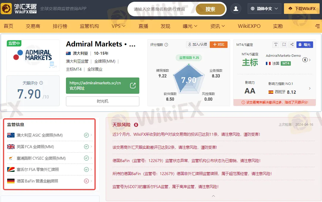 通过外汇天眼查询可知,Admiral Markets目前受到澳大利亚证券和投资委员会(ASIC)、英国金融行为监管局(FCA)以及塞浦路斯证券交易委员会(CySEC)等监管机构的监管。持有澳大利亚证券和投资委员会(ASIC)全牌照(MM)、英国金融行为监管局(FCA)全牌照(MM)、塞浦路斯证券交易委员会(CySEC)全牌照(MM)、塞舌尔金融服务管理局(FSA)零售外汇牌照。此外,所持的德国BaFin(监管号:122679)德国非外汇牌照监管牌照,监管状态异常,监管机构公布状态为已撤销,而监管号为SD073的塞舌尔FSA监管,属于离岸监管,请注意风险!