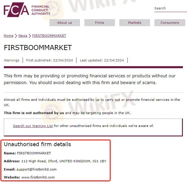 FCA认为FIRSTBOOMMARKET存在欺诈投资者、非法集资等严重违法行为的可能。并警告投资者不要与该公司进行任何交易或投资,如果一旦遭受资金损失,将无法使用金融申诉专员服务或受到金融服务补偿计划 (FSCS) 的保护。