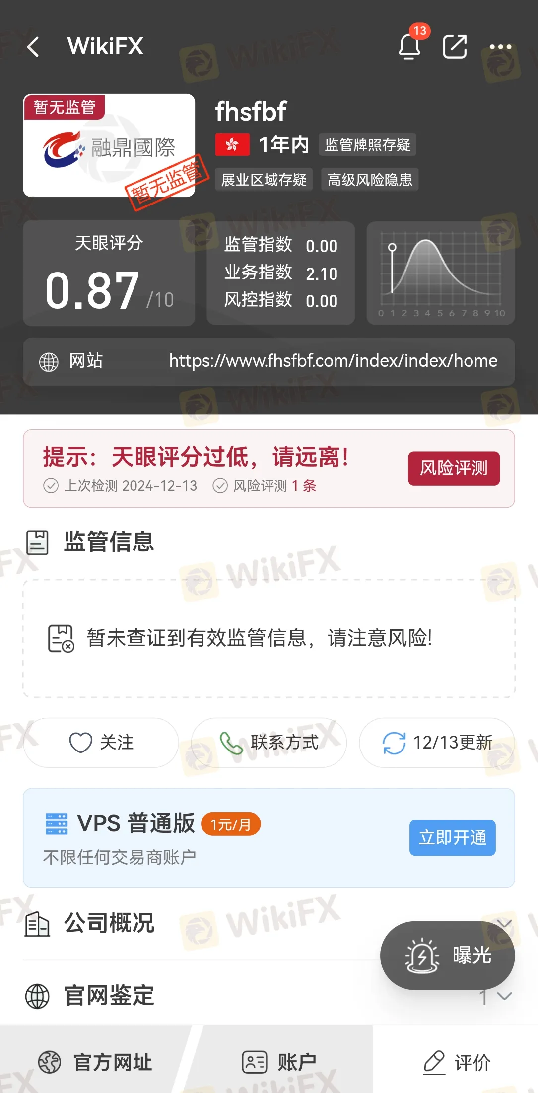 首先,让我们来看看fhsfbf融鼎国际的背景。使用外汇天眼APP查询得知,我们发现,这个成立不到一年的平台,不仅信息极其有限,而且并未提供任何合法的监管牌照。更糟糕的是,这个平台根本没有使用正规的交易软件,许多交易者可能因此在不知情的情况下暴露自己的资金风险。