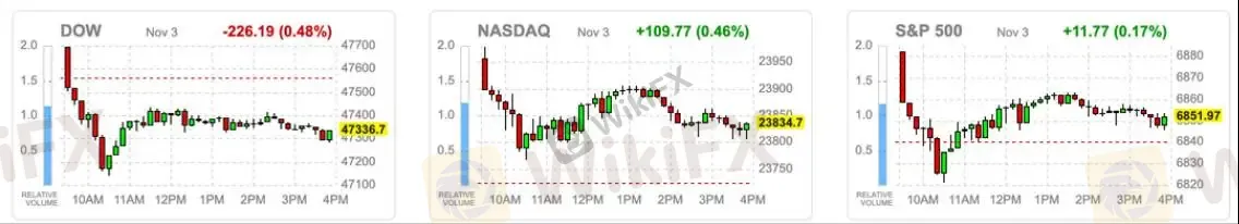 虽然美联储内部对12月政策意见分歧,市场早盘一度震荡,但因ISM价格指数下降、企业财报普遍优于预期,以及11月历来为美股强势月份,资金随即回流。板块方面,非必需消费类股领涨,亚马逊飙升4%、特斯拉(TSLA)上涨2.6%;AI与半导体股延续强势,英伟达涨2.2%、美光(MU)与西部数据(WDC)均涨近5%。整体来看,AI与云计算合作再度点燃市场风险偏好,推动主要指数收高。