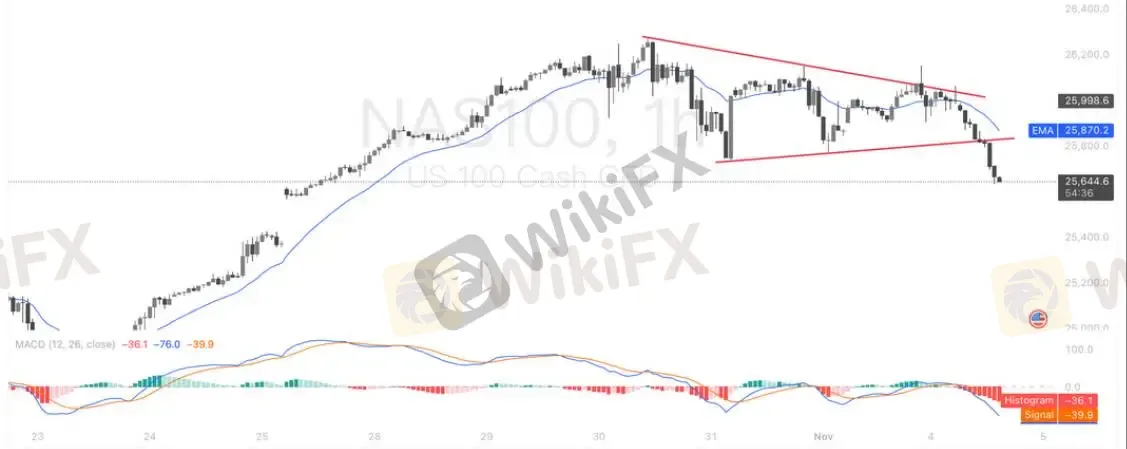 纳指100在小时级别图上跌破了收敛三角形下沿,短线结构转弱,显示下行趋势可能延续。价格目前已明显跌破20周期EMA(25,871)及下方支撑线,确认空方动能占优。