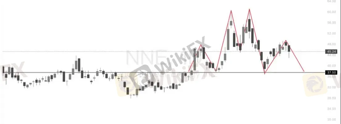 NNE股价在日线图上逐步形成头肩顶形态,目前右肩已出现回落迹象,显示上方压力增强。若价格持续受阻于48美元附近并跌破颈线支撑37.50,将确认形态成立,技术面将释放进一步下行信号。
