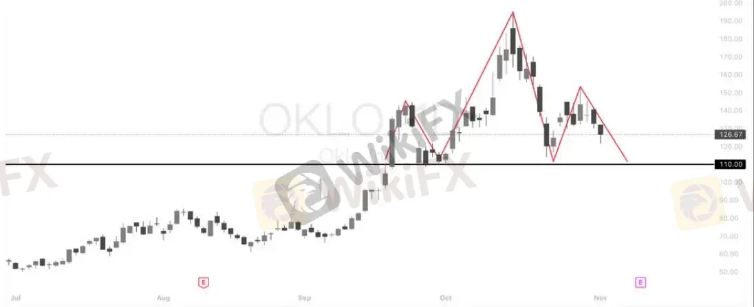 OKLO股价在日线级别上构筑出潜在的头肩顶形态,目前右肩已基本成型,价格再度承压下行。若后续跌破关键支撑位110美元,将确认形态成立,或触发新一轮下跌行情。