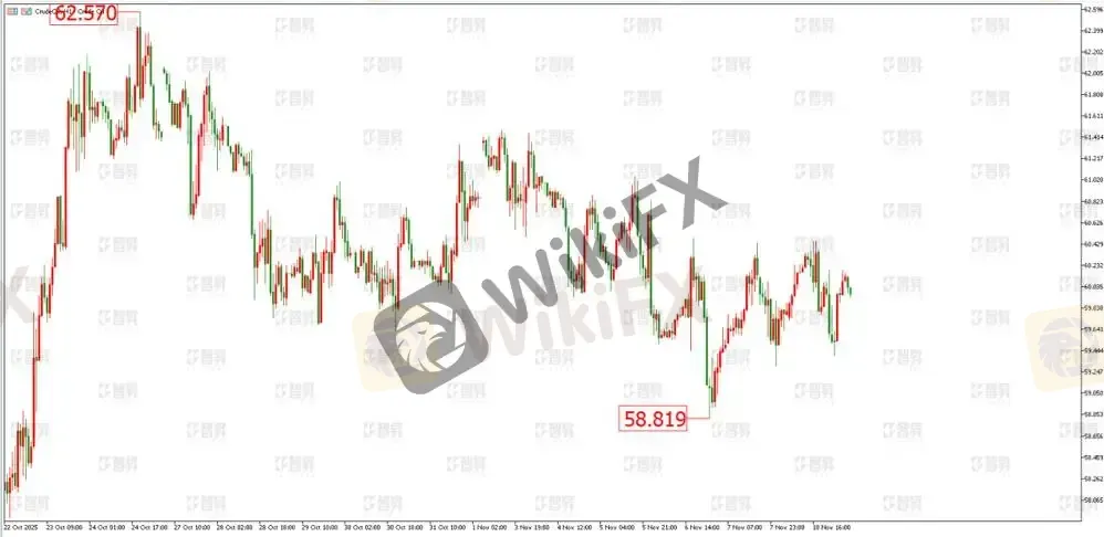 原油近两周震荡偏下,走势偏弱。小时图来看,若下破58.80美元则延续震荡下行;若上破60.40美元则有望冲击62.57美元的前高点,甚至形成新一轮上涨走势。