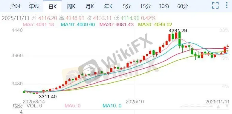 摘要:周二(11月11日)亚市早盘,现货黄金延续隔夜涨势,一度触及4120关口,刷新近两周高点。周一现货黄金大涨2.85%,收报4115美元附近,这是自10月23日以来的最高收盘价。现货白银更是不甘示弱,涨幅超过4%,创下10月21日以来最高水平。在美国经济数据疲软与美联储降息预期升温的双重推动下,黄金作为非孳息资产的避险魅力全面爆发。一、多重因素推动金价此轮反弹1、美联储降息预期升温据CME“美联储观
