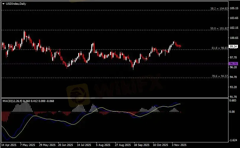 日线图显示美元指数回调下挫,当前仍收于98.80支撑。从MACD来看,快慢线死叉依旧,白色动能柱收缩殆尽。指数走势基本和动能柱的变化一致。