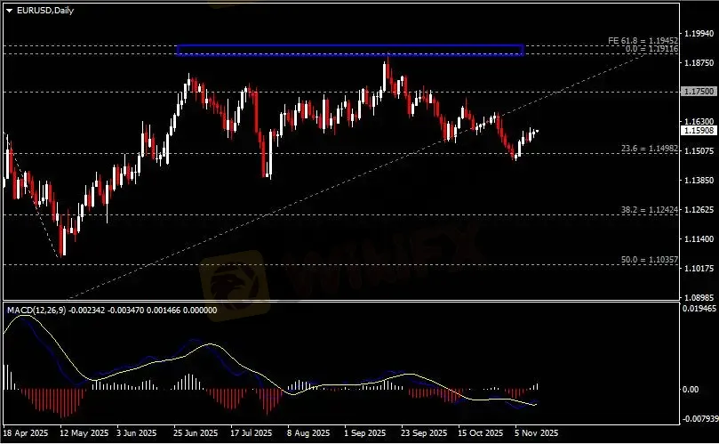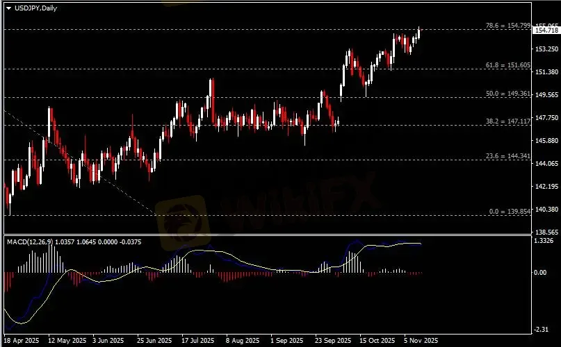 日线图显示美元兑日元震荡上行,当前测试154.80阻力。从MACD来看,快慢线欲形成金叉,红色动能柱温和收缩。汇价走势基本和动能柱的变化一致。