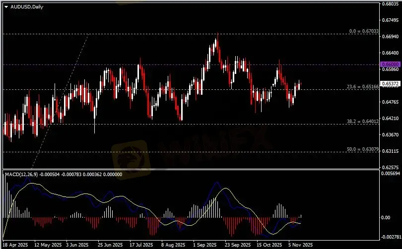 日线图显示澳元兑美元震荡走强,当前企稳于0.6520支撑。从MACD来看,快慢线形成金叉,白色动能柱温和放量。汇价走势基本和动能柱的变化一致。