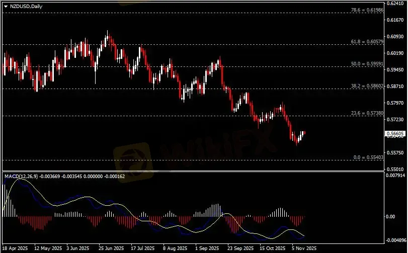日线图显示纽元兑美元反弹上行,当前仍承压于0.5740阻力。从MACD来看,快慢线欲形成金叉,红色动能柱温和收缩。汇价走势基本和动能柱的变化一致。