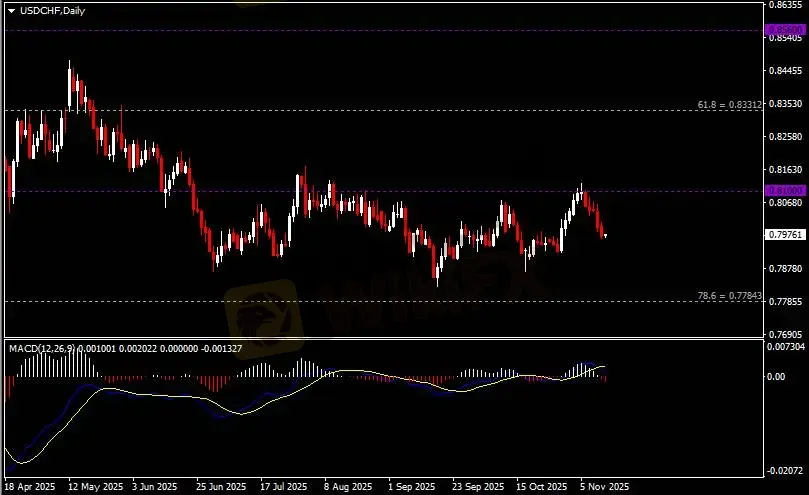 日线图显示美元兑瑞郎震荡下挫,当前承压于0.81关键阻力。从MACD来看,快慢线死叉依旧,红色动能柱温和增量。汇价走势基本和动能柱的变化一致。