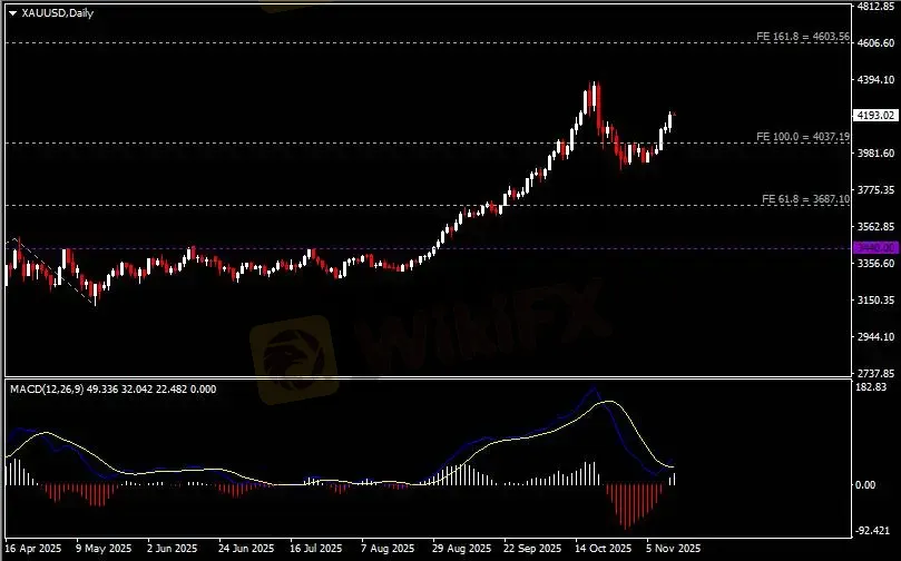 日线图显示金价震荡上行,当前企稳于4040支撑。从MACD来看,快慢线金叉依旧,白色动能柱温和放量。金价走势基本和动能柱的变化一致。