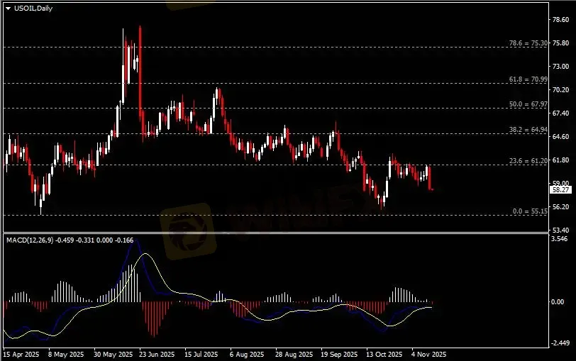 日线图显示油价遭遇空头抛售,当前承压于61.20阻力。从MACD来看,快慢线形成死叉,白色动能柱收缩殆尽。油价走势基本和动能柱的变化一致。