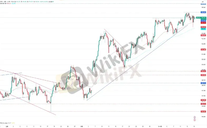 摘要:美元/日币(USDJPY):新闻事件:周五,美元/日元持平于154.520日元。展望上周,美国史上持续最久的政府关门于周四结束,市场正等待美国政府公布此前延后发布的经济数据,以权衡权衡美联储12月降息的可能性。近期由于美联储内部对政策路径存在明显分歧,市场对美联储12月降息25个基点的预期低于50%。在日本方面,由于高市早苗领导的新政府释放出更积极的财政政策讯号,日元持续承压。此前,日本财务大臣片