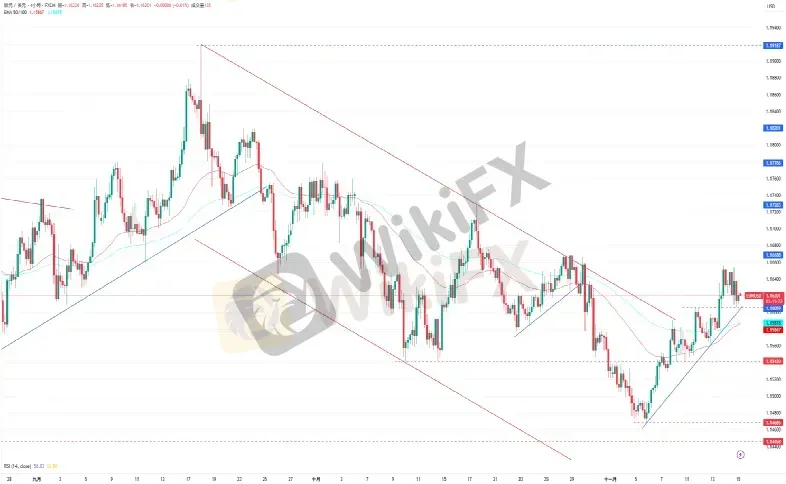 CPT Markets分析师指出,欧元/美元受下方上涨趋势线的支撑,保持在1.16688的阻力水平下方盘整。上涨方面,欧元/美元目前的阻力为10月29日的高点1.16688,再来是10月17日的高点1.17283。下跌方面,欧元/美元目前的支撑为EMA50所在的1.15854水平,再来是11月10日的低点1.15411。