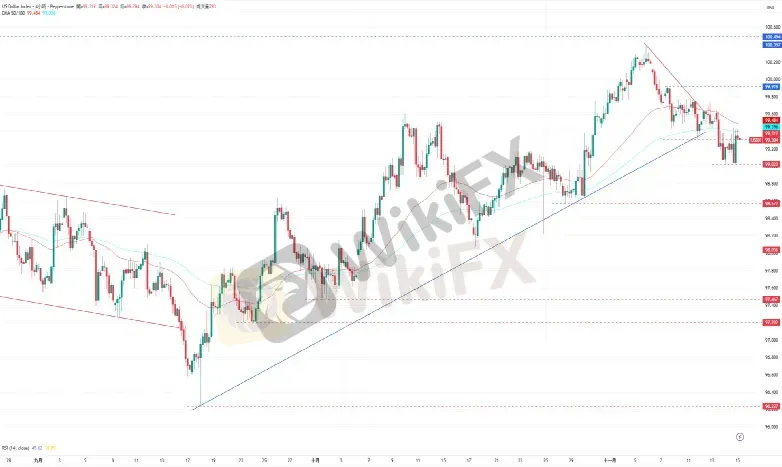 CPT Markets分析师指出,美元指数保持在99.023上方盘整,以消化RSI指针的超卖讯号,由于价格保持在EMA50下方交易,因此短期走势仍然偏看跌。下跌方面,美元指数目前的支撑为11月14日的低点99.023,接着是10月28日的低点98.572。上涨方面,美元指数目前的阻力为11月7日的高点99.919,再来是11月5日的高点100.397。