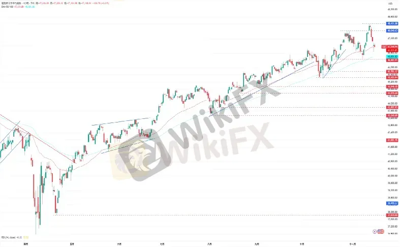 道琼指数继续延续自48431点的回落,并尝试站稳在EMA50均线的所在水平。下跌方面,道琼指数目前的支撑为10月22日低点46461点,接着为10月16日低点45781点。上涨方面,道琼指数目前的阻力为11月12日的历史高点48431点。