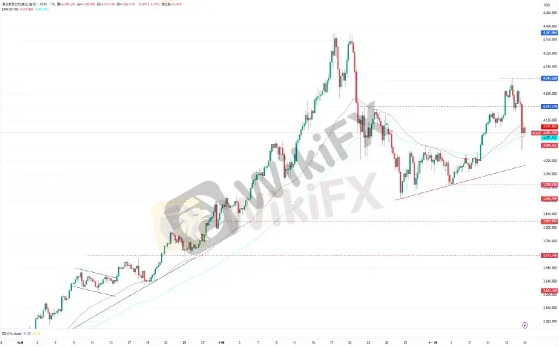 CPT Markets分析师指出,黄金价格继续自4245美元的回落,并且在跌破EMA50均线后保持在其下方交易。下跌方面,黄金目前的支撑为11月14日的低点4031美元,再来11月5日的低点3930美元。上涨方面,黄金目前的阻力为11月13日高点4245美元,再来是4300美元水平与10月17日的高点4381美元。