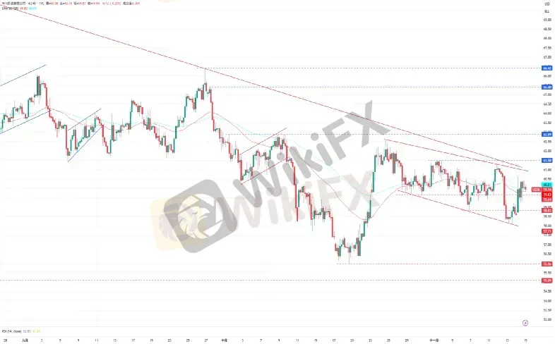 WTI原油自在58.12美元反弹,并尝试站稳于EMA50均线上方。上涨方面,WTI原油目前的阻力为11月3日的高点61.50美元,再来10月24日的高点62.59美元。下跌方面,若回落至EMA50下方,WTI原油目前的支撑为11月13日低点58.12美元,再来是10月20日的低点55.96美元。