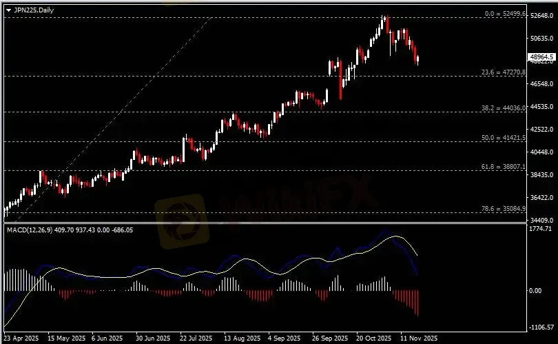 隔夜,JPN225指数进一步遭遇空头抛售并创下近一个月新低。截至收盘,该指数录得48,639,较本月初旬所见的历史峰值下滑了近8%。