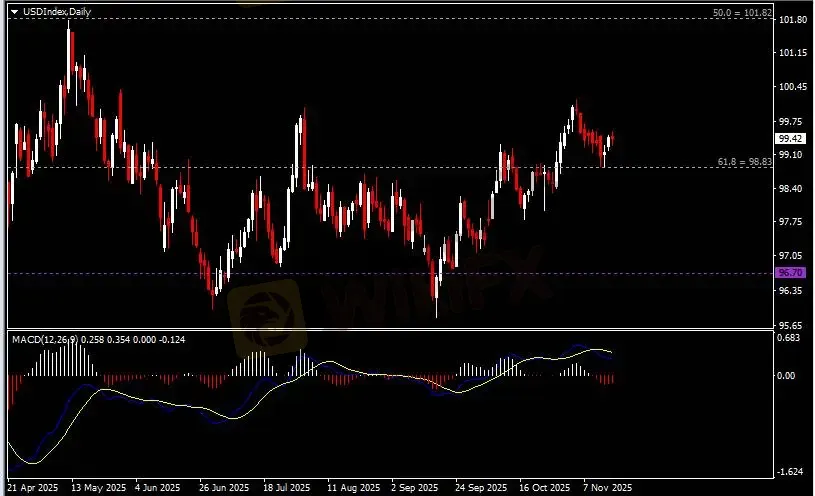 日线图显示美元指数反弹暂缓,当前收于98.80支撑。从MACD来看,快慢线向下运行,红色动能柱则温和收缩。指数走势和动能柱的变化稍有分歧。