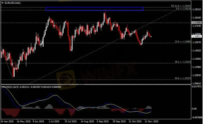 日线图显示欧元兑美元回调下挫,当前仍企稳于1.15关键支撑。从MACD来看,快慢线呈拐向,白色动能柱温和收缩。汇价走势基本和动能柱的变化一致。
