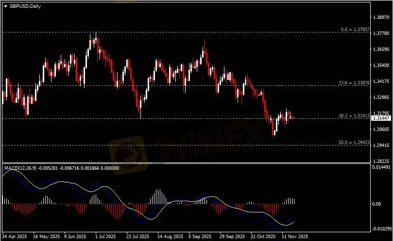 日线图显示英镑兑美元于区间窄幅震荡,当前仍收于1.3140支撑。从MACD来看,快慢线向上运行,白色动能柱则温和收缩。汇价走势基本和动能柱的变化一致。