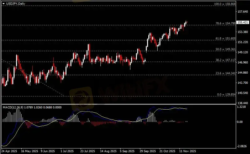 日线图显示美元兑日元震荡走强,当前收于154.80支撑。从MACD来看,快慢线形成金叉,白色动能柱显示汇价动能有限。汇价走势和动能柱的变化呈分歧。