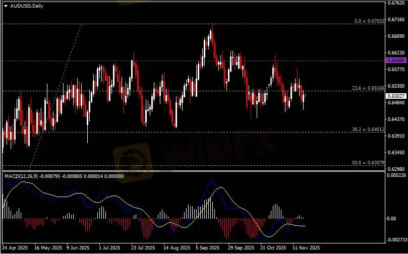 日线图显示澳元兑美元企稳反弹,当前回测0.6520阻力。从MACD来看,快慢线欲形成死叉,白色动能柱温和收缩。汇价走势和动能柱的变化呈分歧。