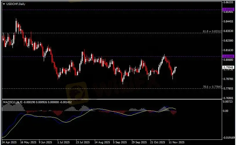日线图显示美元兑瑞郎震荡上行,当前仍承压于0.81关键阻力。从MACD来看,快慢线呈拐向,红色动能柱温和收缩。汇价走势基本和动能柱的变化一致。