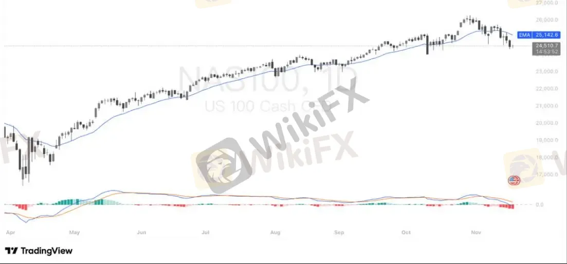 技术面上,纳指连续多日收在 EMA20(25,142) 下方,确认短线趋势由强转弱,MACD 死叉后动能持续扩大,显示卖压尚未释放完毕。目前指数在 24,300–24,500 区间企稳,但若 NVDA 财报不及预期,指数可能进一步测试 24,000 心理关口;反之如财报超预期,能否重新站回 EMA20 将是判断短线反转的关键。整体结构仍偏弱势震荡,方向将在本周财报和数据公布后正式揭晓。