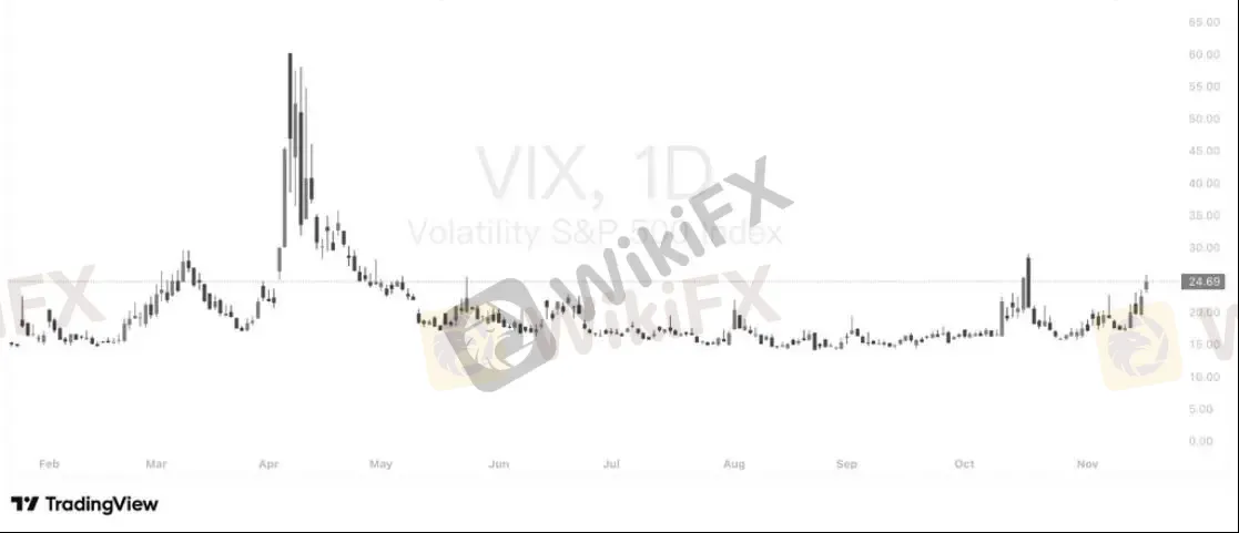 从图表来看,VIX 已连续多日走高,并在最新交易日跳涨至 24.69(+10.32%),正式突破自 8 月以来反复受压的 20–22 区间上沿,意味着市场风险情绪正快速恶化。