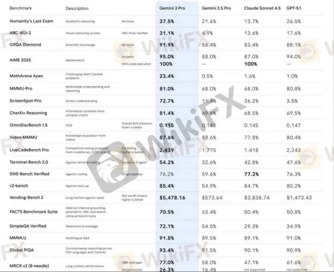 谷歌正式发布 Gemini 3 Pro 模型卡,成为 Google AI 战略的里程碑级事件,市场对其技术突破与商业化前景迅速升温,形成强烈催化效应。Gemini 3 Pro 在多模态、数学推理、长文本处理等维度全面领先主流竞争对手(GPT-5.1、Claude 4.5、Gemini 2.5),并在 AIME 2025 高难度数学题的“有代码执行”场景中拿下满分,重塑外界对 Google AI 技术实力的认知。