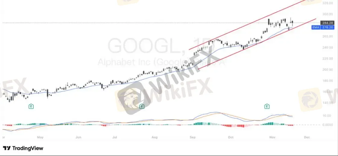 GOOGL 当前稳居上升通道结构中轨附近,整体依旧维持强势多头趋势。股价多次在 EMA20(约 276 美元) 获得有效支撑,回踩后迅速被买盘推起,显示趋势买盘仍然主导。MACD 虽处于短线回落区间,但仍在零轴上方运行,属健康的动能修复而非趋势反转。