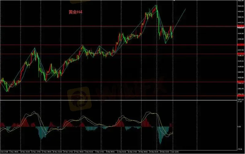 H4图表金价短期或结束回调走势,关注下方4300支撑位,是否能有效支撑;若获得有效支撑则结束回调走势继续上冲。