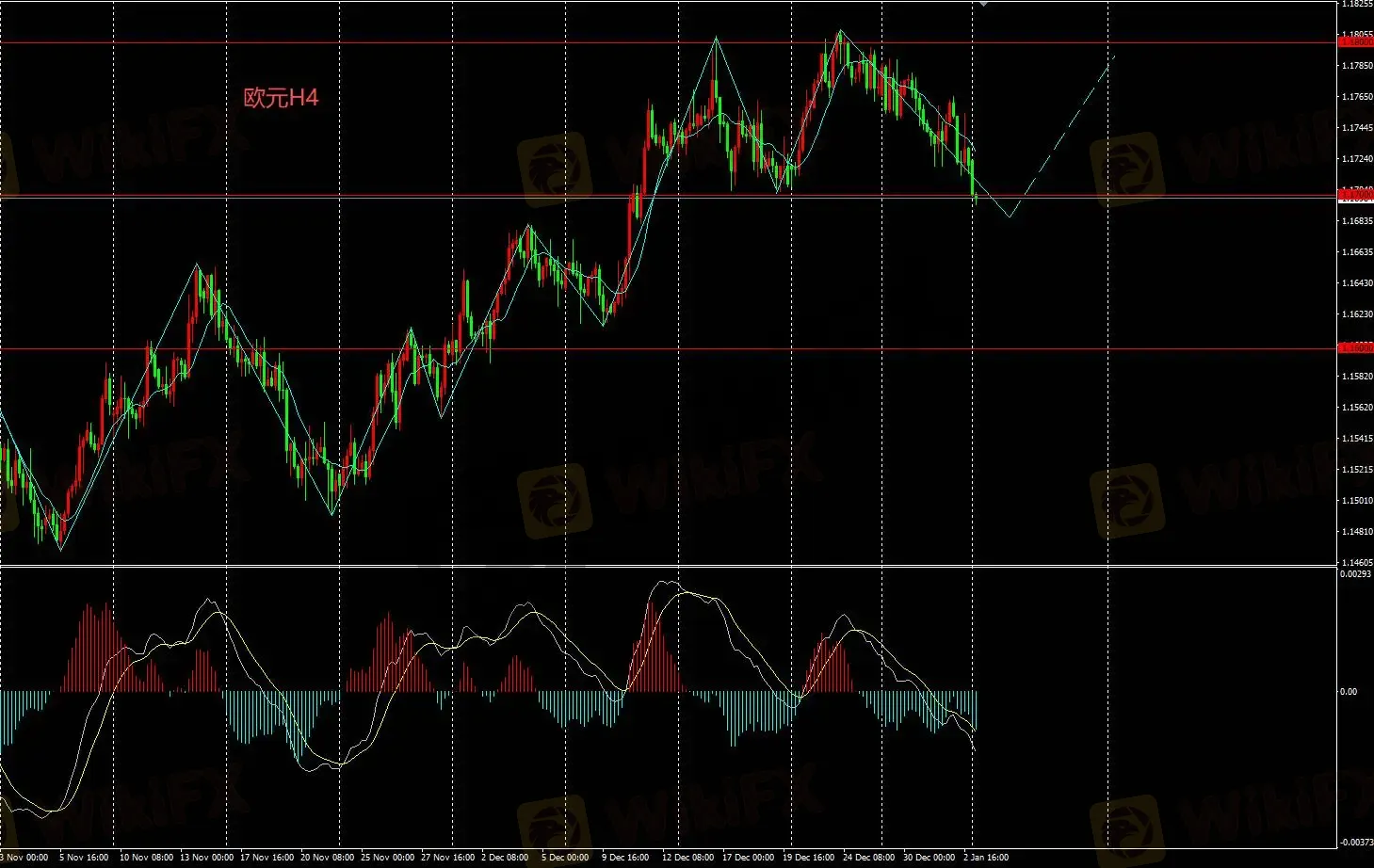 H4图表价格在1.18下方小幅度反复的拉扯后下挫,等待回调企稳,总体看多。